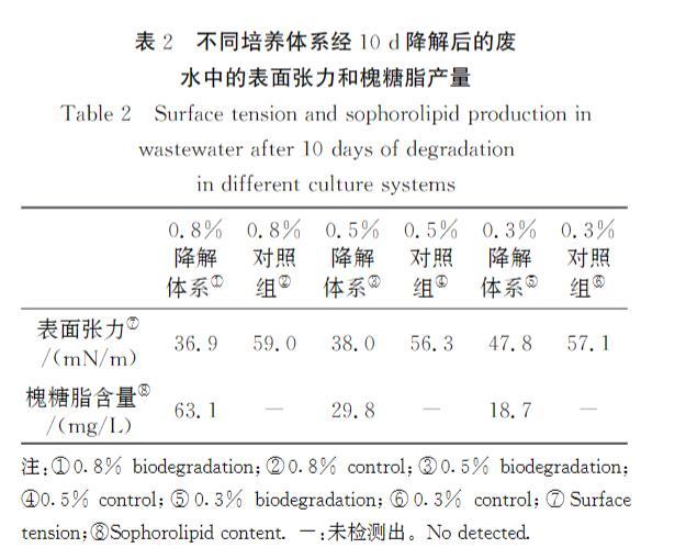 表2不同培養(yǎng)體系經(jīng)10d降解后的廢水中的表面張力和槐糖脂產(chǎn)量