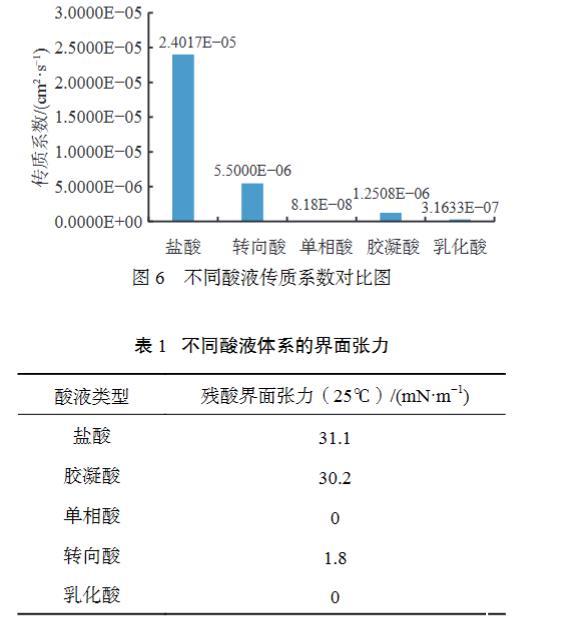 以鹽酸、膠凝酸、轉(zhuǎn)向酸和乳化酸為對(duì)比,測(cè)定不同酸液體系傳質(zhì)系數(shù),實(shí)驗(yàn)結(jié)果見(jiàn)圖6。單相酸體系緩速效果最強(qiáng),比乳化酸體系還下降了一個(gè)數(shù)量級(jí),緩速率為99.6%,可以達(dá)到緩速深部酸化的效果。單相酸相比于乳化酸酸巖反應(yīng)速度明顯下降,這與乳化酸粒徑研究結(jié)論也是相似的:粒徑越小,酸巖反應(yīng)速度越慢。