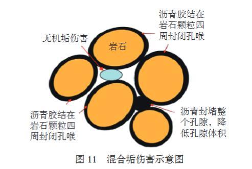 通過(guò)觀(guān)察傷害后巖心表面,可以發(fā)現(xiàn)瀝青在孔隙系統(tǒng)中的分布模式如圖11所示。對(duì)于孔隙系統(tǒng)來(lái)說(shuō),瀝青膠結(jié)在巖石顆粒四周,這類(lèi)瀝青可能對(duì)減小孔隙體積作用不明顯,但其可以顯著限制或封閉孔喉,導(dǎo)致滲透率下降;另一種充填在孔隙內(nèi),堵塞整個(gè)孔隙,降低孔隙體積。儲(chǔ)層中的瀝青占據(jù)儲(chǔ)層的部分儲(chǔ)集空間,破壞儲(chǔ)層孔隙結(jié)構(gòu),不僅會(huì)減小儲(chǔ)層的孔隙度,同時(shí)還會(huì)大幅度減低儲(chǔ)層滲透率,嚴(yán)重影響儲(chǔ)層物性及油氣井產(chǎn)能。