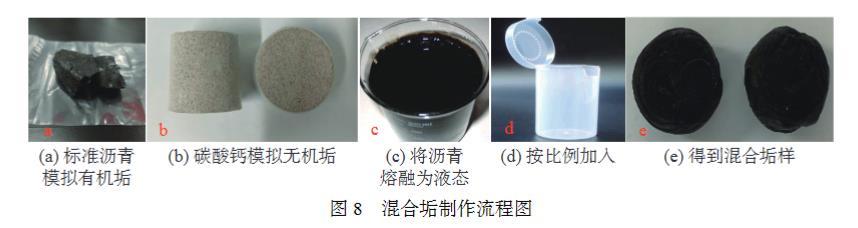 采用瀝青塊模擬有機(jī)垢,碳酸鈣(灰?guī)r)模擬無(wú)機(jī)垢,瀝青和碳酸鈣3∶7混合物模擬混合垢?;旌瞎笜又谱鞑襟E如下:①將瀝青塊敲成小塊放入燒杯;②控溫磁力攪拌器將瀝青融化為液態(tài);③將液態(tài)瀝青趁熱導(dǎo)入塑料試管中;④再按比例加入碳酸鈣,在瀝青凝固前攪拌均勻;⑤得到比表面積接近混合垢(瀝青碳酸鈣質(zhì)量比為3∶7),混合垢制作流程圖見(jiàn)圖8。