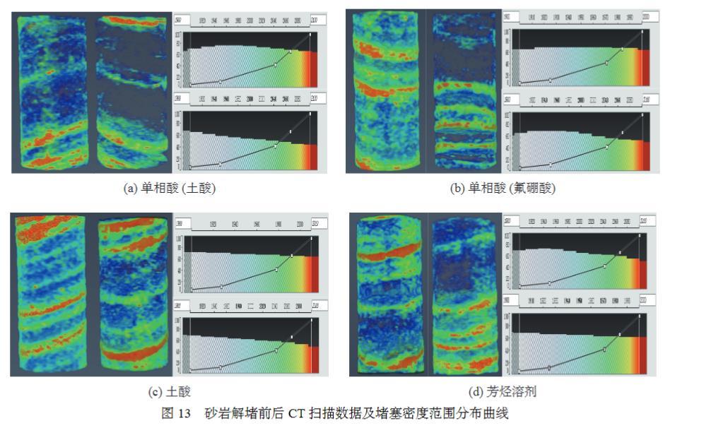 圖13砂巖解堵前后CT掃描數(shù)據(jù)及堵塞密度范圍分布曲線(xiàn)