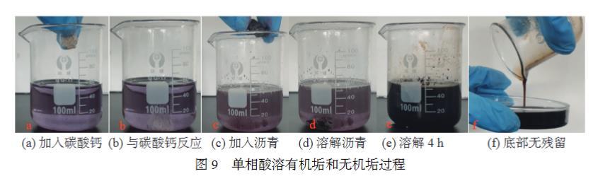 分別對(duì)鹽酸、芳烴溶劑、單相酸溶解有機(jī)垢、無(wú)機(jī)垢及其混合垢性能進(jìn)行測(cè)試。實(shí)驗(yàn)條件:90℃水浴,50 g溶液,2.5 g垢樣,溶解4 h,實(shí)驗(yàn)結(jié)果見(jiàn)表2。從表2可以看出,單相酸對(duì)混合垢溶解效率遠(yuǎn)高于單一解堵體系,具備同時(shí)解除有機(jī)垢、無(wú)機(jī)垢及其混合垢的能力。單相酸溶有機(jī)垢和無(wú)機(jī)垢過(guò)程圖片見(jiàn)圖9,當(dāng)碳酸鈣加入后,單相酸與碳酸鈣反應(yīng)較明顯;當(dāng)瀝青加入后,常溫下溶解較慢,90℃水浴4 h后完全溶解;溶解后的殘液倒出后,燒杯底部無(wú)殘留,表明單相酸可以完全溶解有機(jī)垢(碳酸鈣)和無(wú)機(jī)垢(瀝青)。