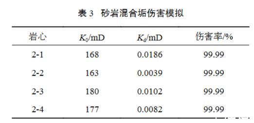 在該實(shí)驗(yàn)方案下,交替注入的碳酸鈉溶液與氯化鈣溶液會(huì)在孔隙中形成白色的碳酸鈣沉淀,瀝青飽和進(jìn)入孔隙中經(jīng)過(guò)正庚烷的揮發(fā)瀝青黏度急劇增加,封堵孔隙造成滲透率下降,可以模擬混合垢?jìng)ι皫r儲(chǔ)層。由表3可見(jiàn),獲得的砂巖混合垢?jìng)β蚀笥?9%,傷害后巖心滲透率小于0.02 mD,傷害顯著。