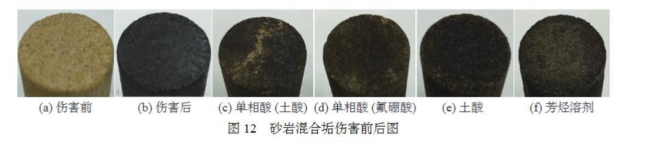 實(shí)驗(yàn)?zāi)M改變單相酸的酸相(土酸、氟硼酸)與土酸和芳烴溶劑進(jìn)行對(duì)比實(shí)驗(yàn),實(shí)驗(yàn)結(jié)果見(jiàn)表4。巖心傷害前后及采用不同體系解堵后的巖心端面照片見(jiàn)圖12。實(shí)驗(yàn)結(jié)果顯示芳烴溶劑和土酸只能部分解除砂巖巖心傷害,單相酸體系不僅可以解除有機(jī)垢和無(wú)機(jī)垢?jìng)?,還能酸蝕增滲,使得傷害解除后巖心滲透率高于傷害前巖心滲透率。