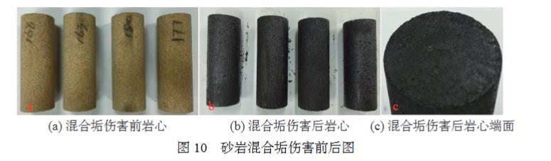 為在室內(nèi)模擬混合垢巖心傷害,設(shè)計(jì)如下實(shí)驗(yàn)步驟:①氣測(cè)巖心初始滲透率;②模擬無(wú)機(jī)垢?jìng)Γ菏褂?0.5%碳酸鈉溶液與15%氯化鈣溶液交替注入,模擬無(wú)機(jī)垢(CaCO3)的損害;③模擬有機(jī)垢?jìng)Γ?0%的瀝青正庚烷溶液與二甲苯1∶1混合,抽真空進(jìn)行巖心飽和,傷害72 h后烘干;④傷害后巖心氣測(cè)滲透率;⑤計(jì)算傷害率。混合垢?jìng)η昂笊皫r巖心圖片見(jiàn)圖10。