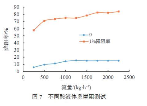 采用摩阻測(cè)試儀測(cè)定單相酸的降阻率,實(shí)驗(yàn)結(jié)果可以看出,在不加減阻劑的情況下,單相酸與水的摩阻相當(dāng),表明不加減阻劑情況下,單相酸不具備減阻效果;加入0.1%減阻劑后,可明顯降低單相酸摩阻,降阻率可達(dá)80%以上,摩阻和膠凝酸相當(dāng),遠(yuǎn)低于乳化酸摩阻。