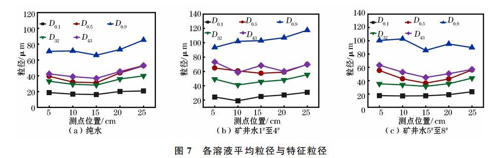 礦井水1#至8#在15cm處的平均粒徑和特征粒徑逐漸增大,這說明表面張力對噴霧平均粒徑和特征粒徑具有直接影響。礦井水1至4#各平均粒徑和特征粒徑之間差異明顯,而其余溶液差異較小,這表明純水和礦井水5#至8#的噴霧粒徑分布優(yōu)于礦井水1至4,霧場中霧滴更趨向均一化分布,易于捕集沉降粉塵。綜上,礦井水中Na+、K+離子濃度對其表面張力及噴霧液滴粒徑變化趨勢至關重要,對于霧場中噴霧粒徑的均一性和各平均粒徑和特征粒徑的差異性也有重要影響。