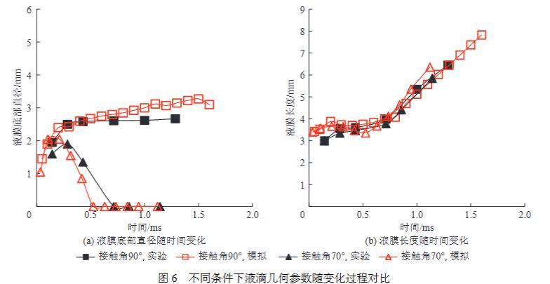 為進(jìn)一步驗(yàn)證本模型計(jì)算結(jié)果的可靠性,依據(jù)BANITABAEI等在實(shí)驗(yàn)中設(shè)置的不同碰撞條件,開(kāi)展了相應(yīng)的數(shù)值模擬。如圖5b和圖5c所示,在不同碰撞條件下,數(shù)值模擬結(jié)果中的液滴形變過(guò)程與實(shí)驗(yàn)結(jié)果均具有較高的吻合度。圖6對(duì)比了數(shù)值模擬結(jié)果與實(shí)驗(yàn)結(jié)果中液滴幾何尺寸的變化過(guò)程,也具有較高的吻合度。其中,圖6a所展示的液膜底部直徑隨時(shí)間變化曲線(xiàn),數(shù)值模擬結(jié)果與實(shí)驗(yàn)結(jié)果稍有偏差,原因是實(shí)驗(yàn)中固定顆粒的支撐柱對(duì)液膜底部的形變過(guò)程產(chǎn)生了一定影響。綜上所述,可認(rèn)為筆者構(gòu)建的數(shù)值模擬模型合理,結(jié)果具有較高可靠性。由于在毫米尺度下和微米尺度下,液滴與固體顆粒的碰撞過(guò)程均遵守經(jīng)典牛頓力學(xué)定律和經(jīng)典流體力學(xué)理論,所以本數(shù)值模擬模型可用于微米尺度下的其他工況條件的數(shù)值模擬研究。