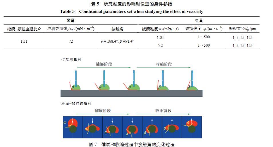 由于碰撞速度、粒徑和液滴黏度均會(huì)對(duì)液滴與顆粒的碰撞行為產(chǎn)生明顯影響,筆者針對(duì)這幾個(gè)因素設(shè)置了不同的數(shù)值模擬工況。具體工況參數(shù)見(jiàn)表5所示,其中液滴鋪展過(guò)程中的前進(jìn)接觸角為α;液滴收縮過(guò)程中的后退接觸角為β。利用數(shù)值模擬軟件的自動(dòng)保存功能,對(duì)碰撞行為發(fā)展過(guò)程中不同時(shí)刻的模擬數(shù)據(jù)進(jìn)行了保存。如圖7所示,當(dāng)液滴在顆粒表面鋪展時(shí),在迭代過(guò)程中將接觸角值設(shè)置為α。在液滴在顆粒表面的鋪展過(guò)程轉(zhuǎn)變?yōu)槭湛s過(guò)程的時(shí)刻,將接觸角數(shù)值由α改為β,再進(jìn)行后續(xù)的迭代計(jì)算。