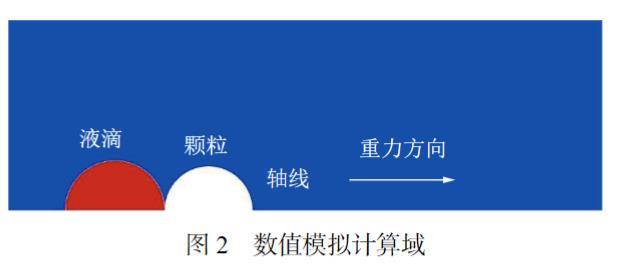 如圖2所示,液滴與顆粒對(duì)心碰撞時(shí),流場(chǎng)在演變過(guò)程將始終保持軸對(duì)稱(chēng)狀態(tài),因此設(shè)置了二維軸對(duì)稱(chēng)計(jì)算域。在相同的網(wǎng)格數(shù)量條件下,二維軸對(duì)稱(chēng)計(jì)算域相較于三維計(jì)算域具有更好的網(wǎng)格質(zhì)量和計(jì)算精度。在分析計(jì)算結(jié)果時(shí),可以通過(guò)鏡像操作得到中軸線(xiàn)截面上的整體流場(chǎng)圖像。由于實(shí)驗(yàn)中最大雷諾數(shù)的數(shù)量級(jí)為104,因此,依據(jù)PASANDIDEH-FARD等的研究結(jié)果,可認(rèn)為在塵?霧碰撞過(guò)程中流場(chǎng)處于層流狀態(tài)。