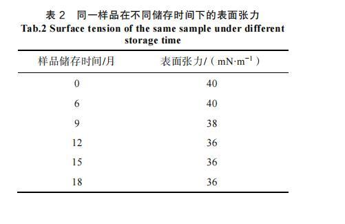 在溫度為23℃、相對濕度為60%的環(huán)境下,測試樣品在不同儲存時間下的表面張力,測得數(shù)據(jù)見表2。由表2可知,樣品轉(zhuǎn)移涂層剛開始成膜時的表面張力為40 mN/m,且樣品儲存6個月以內(nèi)的表面張力基本保持不變。7—9個月出現(xiàn)衰退,降低為38 mN/m,符合真空噴鋁紙行業(yè)標準(BB/T 0054—2010)。儲存12個月至18個月的紙樣表面張力僅為36 mN/m,但并未在儲存18個月時出現(xiàn)進一步的明顯降低。顯然,紙樣的表面張力緩慢降低并不能解釋2.1節(jié)中出現(xiàn)的18個月印刷油墨與轉(zhuǎn)移涂層的附著力差的問題。再根據(jù)相關(guān)研究,表面張力≥38 mN/m的要求,并不直接適用于轉(zhuǎn)移紙印刷的質(zhì)量控制,特別是用于UV膠印的真空噴鋁轉(zhuǎn)移紙的轉(zhuǎn)移涂層。膠印印刷適應(yīng)性并不完全由表面張力所決定。