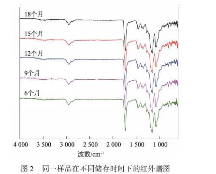 為了探究表面轉(zhuǎn)移涂層是否發(fā)生了結(jié)構(gòu)變化,對不同儲存時間下的樣品進行紅外光譜測試分析,見圖2??梢钥闯觯瑑Υ鏁r間為6—18個月的樣品的紅外譜圖并未發(fā)生明顯變化。譜圖的一致性證明了噴鋁紙表面轉(zhuǎn)移涂層的基本結(jié)構(gòu)并未隨著時間發(fā)生明顯變化,即掉墨現(xiàn)象的出現(xiàn)并非由于轉(zhuǎn)移涂層出現(xiàn)結(jié)構(gòu)變化導致。根據(jù)相關(guān)研究,噴鋁紙在儲存的時候,紙張及涂層中添加的助劑,環(huán)境介質(zhì)中的水分子、油污和空氣等小分子物質(zhì)會通過吸附、擴散、遷移和凝集等作用,甚至鍵合等途徑,在轉(zhuǎn)移涂層表面形成低分子物質(zhì)的富集區(qū),即弱界面層,降低了轉(zhuǎn)移涂層的表面張力,并使其印刷適性變差。