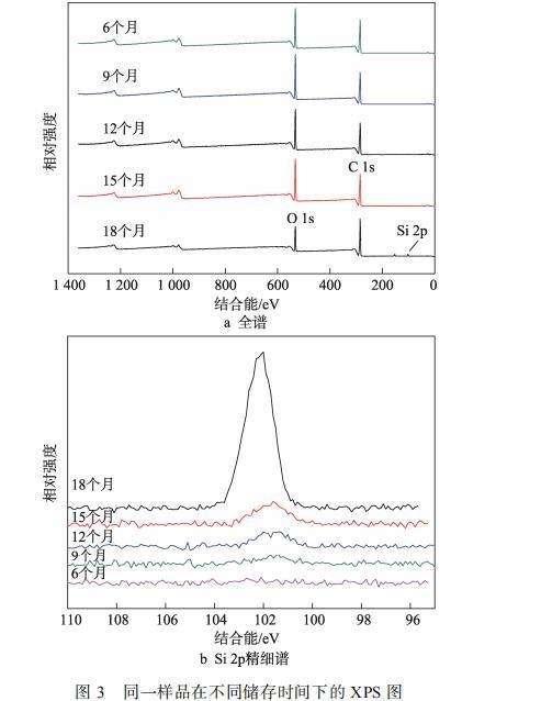 為了探究噴鋁紙表面析出的小分子物質的成分,筆者通過XPS分析儲存時間為6個月、9個月、12個月、15個月、18個月紙張表面元素的變化,見圖3a。在XPS光譜圖中,可以觀察到C 1s,O 1s的特征峰,結合能分別為285.1、532.3 eV。第18個月紙張的XPS光譜圖中,出現(xiàn)了Si 2p的特征峰,結合能為102 eV。由圖3b和表4可知,6—15個月硅含量逐漸增加,元素原子數(shù)分數(shù)由0增至0.6%,但均未出現(xiàn)成型的峰。18個月的紙張表面硅原子數(shù)分數(shù)劇增為3.5%。這表明隨著儲存時間增加,紙張表面逐漸有含硅的無機小分子析出。此外,由表4也可看出,18個月的樣品表面C原子數(shù)分數(shù)明顯升高,從69.9%升至75.1%,O原子數(shù)分數(shù)則由29.5%降低至20.0%,證明硅主要以Si?C鍵的形式存在,析出的有機硅形成了低分子物質弱界面層,降低了樣品涂層的表面張力。