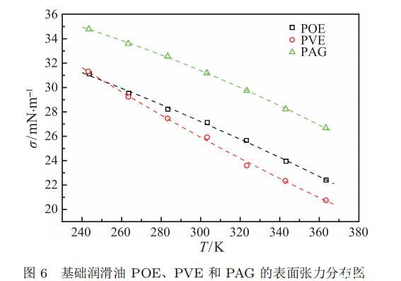 實驗測量了 POE、PVE 和 PAG 三種基礎潤滑油在常壓環(huán)境的表面張力,其溫度范圍為 243.15 ~ 363.15 K,實驗測量結果如表 3 所示。鑒于基礎潤滑油的飽和蒸汽壓非常低,需要在實驗裝置內充入一定壓力氣體來確保懸垂液滴的穩(wěn)定形成,充入的氣體應不易溶于基礎潤滑油且低溫環(huán)境不會在玻璃觀察窗形成凝結液膜,因此在實驗測量過程中裝置內部充入 0.1 MPa 左右的氮氣。根據相應的實驗環(huán)境,表面張力測量所需的密度差 ?ρ 應為基礎潤滑油的液相密度減去氮氣的氣相密度,氮氣的氣相密度由 Refprop 軟件計算獲得。三種基礎潤滑油的表面張力隨溫度的變化趨勢如圖 6 所示,表面張力隨著溫度的增大而降低,在同一溫度條件下,PAG 表面張力最大,POE 次之,PVE 最?。坏?243.15 K 以下區(qū)域,PVE 的表面張力要大于 POE。
