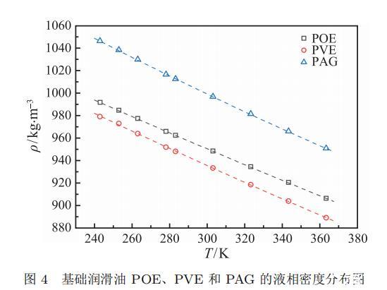 基礎潤滑油的液相密度是開展表面張力實驗研究的基礎數據,本文采用安東帕 DMA5000M 振動管密度計測量了 POE、PVE 和 PAG 三種基礎潤滑油在常壓環(huán)境下的液相密度,溫度范圍為 278.15 ~ 363.15 K。鑒于振動管密度計的測量溫度范圍有限,三種基礎潤滑油在低溫環(huán)境下的液相密度使用比重瓶法進行測量,溫度范圍為 243.15 ~ 278.15 K,其實驗測量結果如表 1 所示。