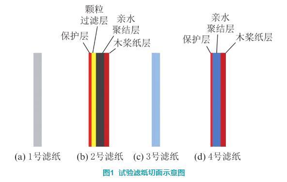 濾紙的切面結(jié)構(gòu)如圖1所示。1號濾紙為單層親水材料。2號濾紙由保護(hù)層a、顆粒過濾層b、親水聚結(jié)層c和木漿紙層d組成,木漿紙作為基層材料,c和d層、b與c層均由樹脂粘結(jié),a與b層通過超聲波焊接在一起。3號濾紙為聚四氟乙烯編織而成的單層網(wǎng)狀濾紙。4號濾紙由保護(hù)層a、疏水過濾層b和基層c組成,4號濾紙的粘結(jié)工藝與2號濾紙相同,保護(hù)層和疏水層由超聲波焊接在一起,基層和疏水層使用樹脂進(jìn)行粘結(jié)。