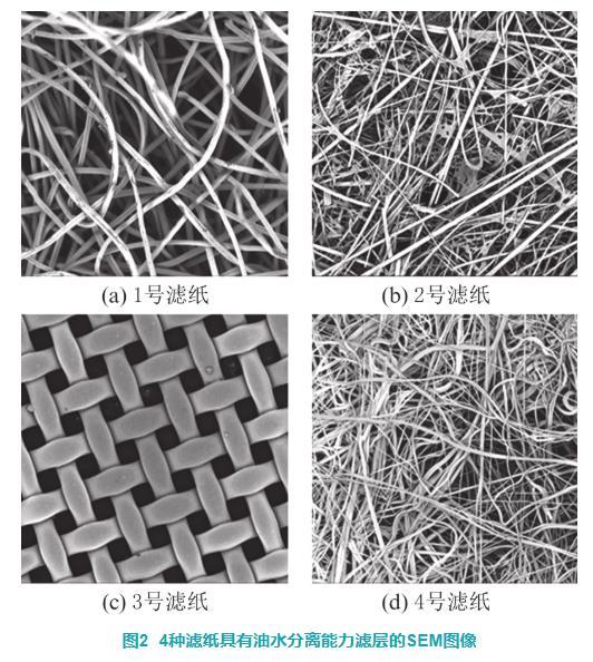 使用Phonem Pro X掃描電子顯微鏡(scanning electron microscope,SEM)在500倍放大倍率下拍攝的4種濾紙的微觀結(jié)構(gòu)如圖2所示。1號濾紙由直徑約為15μm的親水纖維構(gòu)成;2號濾紙的親水層由粗細(xì)不同的纖維通過樹脂粘接而成,其中粗纖維還起到增加親水層物理強(qiáng)度的作用;3號濾紙由直徑約為45μm的聚四氟乙烯纖維絲編制,兩根纖維之間的距離約為44μm;4號濾紙的b層由疏水材料通過熔噴工藝制成,在平面上纖維分布疏密不均但在空間內(nèi)有著較好的孔隙分布。除了3號濾紙外,其余濾紙均具有油水分離層,同時(shí)也具有較為復(fù)雜的空間結(jié)構(gòu)。