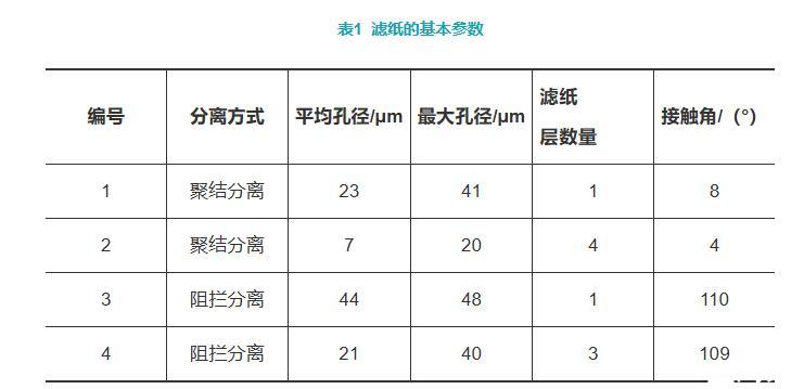 本試驗(yàn)選擇4種具有代表性結(jié)構(gòu)的濾紙,測量其在不同振動(dòng)條件下的油水分離效率,研究其變化規(guī)律,濾紙的基本參數(shù)如表1所示。1號和2號為聚結(jié)式濾紙,3號和4號為阻攔式濾紙。