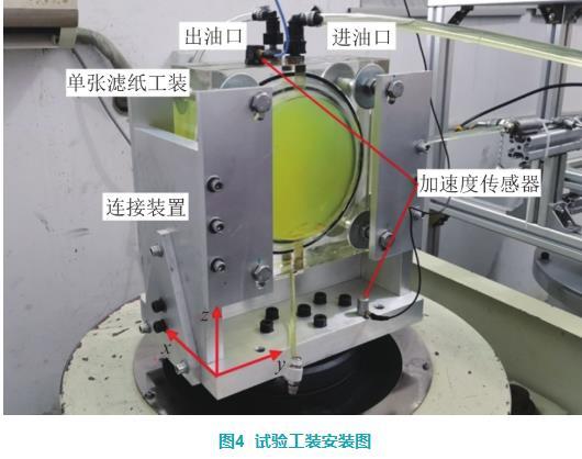 單張濾紙工裝由兩塊50 mm厚的有機(jī)玻璃制成,在頂部加工進(jìn)出油口,在底部加工放水口。單張濾紙工裝和振動(dòng)試驗(yàn)臺通過一個(gè)特制的鋁質(zhì)底座進(jìn)行連接,如圖4所示。