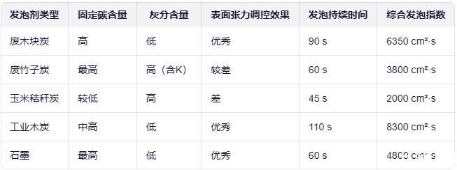 從數(shù)據(jù)可見(jiàn),廢木塊炭和工業(yè)木炭因固定碳高、灰分低,表面張力調(diào)控能力優(yōu)秀,發(fā)泡持續(xù)時(shí)間長(zhǎng),綜合性能突出。廢竹子炭雖固定碳最高,但灰分中高鉀元素導(dǎo)致表面張力變化過(guò)快,泡沫穩(wěn)定性下降。