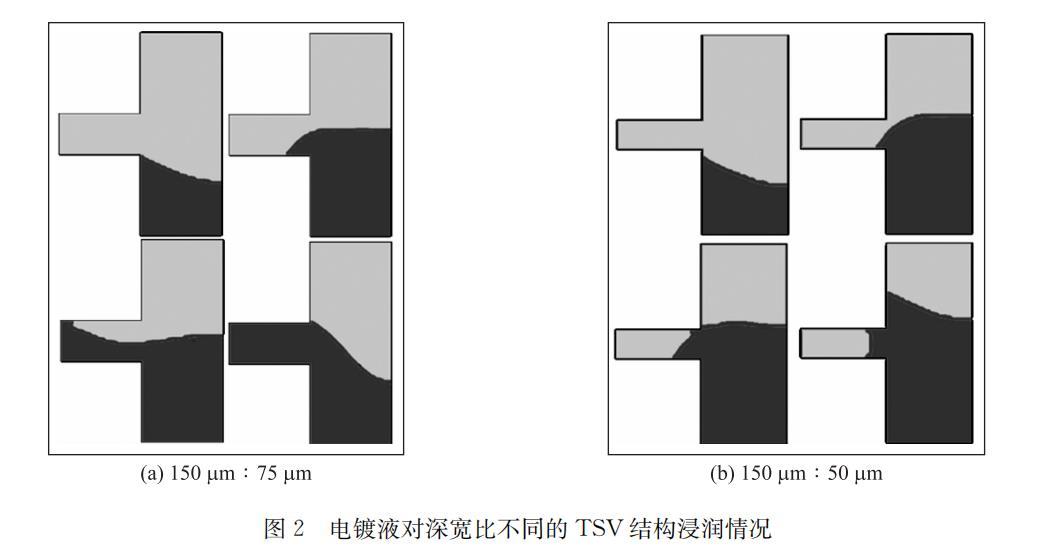 深寬比為150μm:75μm和150μm:50μm的TSV浸潤仿真結(jié)果分別如圖2的(a)(b)所示,前者可以完全浸潤,后者在TSV底部形成氣泡。模擬結(jié)果表明如果不進行充分潤濕,深寬比大于2:1的TSV就會因不能完整浸潤而在靠近TSV底部的位置形成部分表面緊貼TSV側(cè)壁的大氣泡,且該氣泡在之后的電鍍過程中難以排出,導(dǎo)致電鍍液無法接觸到TSV底部附近的位置,進而形成較大空洞。