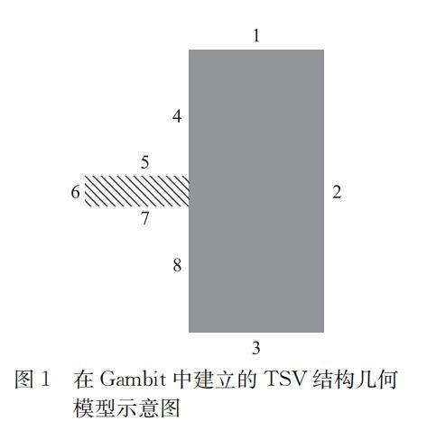 按照實際電鍍液及樣片的情況,在流體仿真軟件中進行建模。主要分為2個部分:前處理軟件Gambit中對平面模型的建立,F(xiàn)luent中對流場進行具體解算。本文截取TSV軸對稱結(jié)構(gòu)的中心軸截面,建立二維分析模型,直接反應(yīng)實際TSV的浸潤過程。同時,基于對比實驗考慮,忽略電鍍液組分與被浸潤表面化學(xué)反應(yīng)造成的界面影響,并直接采用與電鍍液物理性質(zhì)基本相同的水作為液相組分。氣相組分中采用理想不可壓氣體假設(shè)模擬正常大氣壓下的操作環(huán)境。建立的Fluent分析模型如圖1所示。其中較小的矩形塊代表TSV,4~8代表被潤濕表面。初始情況下,所有被模擬區(qū)域為氣相區(qū)域,之后液相從邊界3以特定流速進入(除流速討論單元,其余均設(shè)置為0.05 m/s),逐步潤濕全部或局部表面,直至從邊界1流出。具體設(shè)置為邊界1為壓力出口,2為對稱邊界,3為速度人口,4、5、6、7、8均為壁面邊界條件。表面張力和接觸角均采用實際測量值0.06 N/m,64°;重力加速度為9.81 m/s2,方向為豎直向下。
