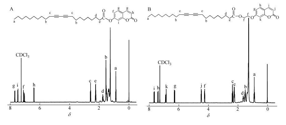 2類香豆素取代二乙炔單體參照文獻所述方法合成,分子結(jié)構(gòu)及產(chǎn)物核磁譜圖如圖1所示。將2種產(chǎn)物分別溶于氯仿,配成1mg/mL的溶液。亞相為超純水(18.2MΩ·cm)。所有的π-A曲線和LB膜拉制實驗均為20℃條件下在KSV Mini-trough LB膜儀上進行。溶劑充分揮發(fā)后,膜障以5 mm/min的速率對其壓縮,在20℃和恒定膜壓35 mN/m下以2mm/min速率沉積Y-型LB膜。基片為石英片。薄膜的聚合是在16W的紫外燈(波長254nm)輻照下完成的,薄膜表面距離燈管下緣10cm,輻照時間5min。