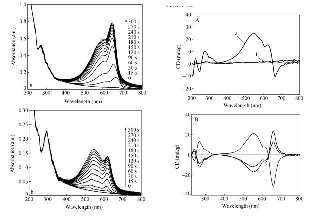 以CODA為例,隨著紫外光輻照時(shí)間增加,LB膜在590和640nm處出現(xiàn)2個(gè)典型的聚二乙炔藍(lán)相吸收峰,且隨時(shí)間增加而逐漸增強(qiáng),薄膜顏色由淡黃色變?yōu)樗{(lán)色。而對(duì)于CO2DA LB膜,隨著254nm紫外光輻照時(shí)間的增加,在540和620nm處出現(xiàn)兩個(gè)明顯的吸收峰,分別對(duì)應(yīng)于聚二乙炔紅相和藍(lán)相的典型吸收,薄膜顏色由淡黃色變?yōu)樽仙?。隨著輻照時(shí)間的增加,540nm處吸收峰明顯增強(qiáng),聚合薄膜中聚二乙炔紅相組分變多。