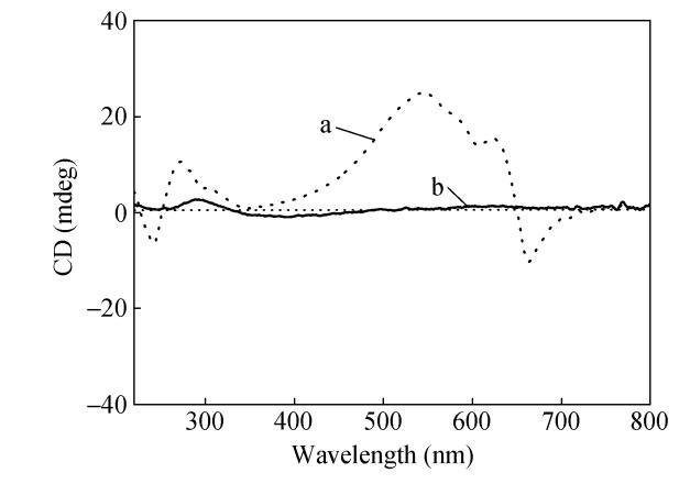 香豆素基團(tuán)在紫外光照條件下可發(fā)生可逆的光二聚反應(yīng):在365nm光輻照下,香豆素基團(tuán)能發(fā)生光二聚反應(yīng),在254nm輻照下香豆素二聚體能可逆地發(fā)生解二聚反應(yīng)。可以預(yù)見(jiàn)香豆素端基的二聚化將影響香豆素取代二乙炔單體在氣液界面的組裝,從而影響聚二乙炔主鏈螺旋結(jié)構(gòu)的形成。我們用365nm紫外燈輻照CODA氯仿溶液20min,此時(shí)香豆素端基能發(fā)生二聚,而二乙炔基團(tuán)不會(huì)發(fā)生聚合。將得到的CODA二聚體的氯仿溶液鋪展在水面上,沉積制備LB膜,制備得到的CODA二聚體LB膜能聚合成藍(lán)相。CD光譜測(cè)試發(fā)現(xiàn)香豆素基團(tuán)和相應(yīng)的聚二乙炔吸收帶均出現(xiàn)了明顯的CD信號(hào),但強(qiáng)度較CODA LB膜均有所減弱,如圖8所示。