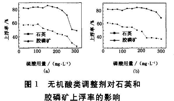硫酸和磷酸是較為有效的膠磷礦抑制劑,工業(yè)應用廣泛??疾靷鹘y(tǒng)調(diào)整劑對石英和膠磷礦可浮性的影響,結(jié)果見圖1。