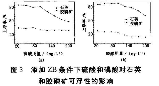 此外使用ZB和硫酸及ZB和磷酸組合的復配藥劑作為調(diào)整劑進行試驗,控制ZB用量為150 mg/L,分別考察添加不同用量的硫酸和磷酸對石英和膠磷礦可浮性的影響,結(jié)果見圖3。