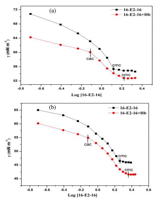 表面張力測(cè)量用于研究 關(guān)于 16-E2-16/Hb 相互作用的定性信息 空氣/水界面。 圖 1 顯示了 16-E2-16 分布的表面張力與對(duì)數(shù)濃度在不存在和 在不同溫度下存在 Hb (5 μM)。 斷點(diǎn) 表面張力與表面活性劑濃度對(duì)數(shù)的關(guān)系 不同溫度下純表面活性劑的文件對(duì)應(yīng) 到相應(yīng)溫度下表面活性劑的 cmc。 這 16-E2-16/Hb體系的表面張力曲線呈現(xiàn)兩個(gè)斷裂 點(diǎn),第一個(gè)斷點(diǎn)對(duì)應(yīng)臨界聚合 濃度(cac)代表表面活性劑的開始 蛋白質(zhì)結(jié)合而作為第二個(gè)斷點(diǎn)對(duì)應(yīng)于 在 Hb 存在下 16-E2-16 的 cmc。 16-E2-16 的 cmc 在不同溫度下不存在和存在 Hb 的情況下 列在表 1 中。從這些值可以看出,16-E2-16 的 cmc 隨著 Hb 的存在和溫度升高而增加。 在 Hb 存在下 cmc 的增加證實(shí)了 16-E2-16/Hb 復(fù)合物的形成,在此期間一些單體 與 Hb 結(jié)合,因此無(wú)法形成膠束 進(jìn)而導(dǎo)致膠束化延遲 [54]。 表1還 表明 cmc 值隨溫度升高而增加 這意味著疏水力的參與,它們是 溫度依賴,在 cmc 的蛋白質(zhì)表面活性劑相互作用中。 這可以歸因于 16-E2-的溶解度增加 16 單體隨溫度變化而抑制膠束化。 此外,較高的溫度有利于熱運(yùn)動(dòng),這會(huì)導(dǎo)致 更多的分子與 Hb 結(jié)合。 但是,cac 保持不變 在所有溫度下。 因此,我們可以認(rèn)為 16-E2-16 與 Hb 結(jié)合 通過 cac 附近的靜電相互作用,因?yàn)殪o電 相互作用不受溫度影響。 此后,作為 表面活性劑濃度增加,蛋白質(zhì)通過疏水力與表面活性劑相互作用。 下表面張力值 Hb-16-E2-16系統(tǒng)比對(duì)應(yīng)的16-E2-16系統(tǒng)是 由于 Hb 的高表面活性。