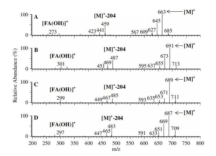 圖3正大氣壓化學(xué)電離(APCI)-來自圖2中每個TIC色譜圖基峰的質(zhì)譜圖。 圖2的TIC中的C16:0二乙?;敝瑑?nèi)酯(RT=16.7分鐘)、圖2的TIC中的C18:0二乙?;敝瑑?nèi)酯(RT=25.2分鐘)、圖2c的TIC中的C18:1二乙酰化槐脂內(nèi)酯(RT=20.7分鐘)和圖2d的TIC中的C18:2二乙?;敝瑑?nèi)酯(RT=15.8)。 ([M]+=質(zhì)子化分子離子;[M]+-204=質(zhì)子化分子離子-減去乙酰化己糖(質(zhì)量204);[FA(OH)]+=質(zhì)子化羥基脂肪酸)