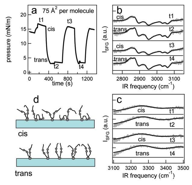圖4。 (a) 在每分子面積為75?2的脂質(zhì)/H2O界面處,作為光開關(guān)脂質(zhì)時間函數(shù)的表面壓力。 用370和450 nm光照射 ~ 100秒分別產(chǎn)生順式(高壓)和反式(低壓)狀態(tài)。 壓力的微小劇烈波動是由于樣品高度的變化,以校正水的蒸發(fā)。 (b和c)CH和OH區(qū)域(灰色)中相應的VSFG光譜以及洛倫茲線形狀模型的擬合(見正文)。 為了清晰起見,光譜已被抵消。 t1至t4對應于面板a中獲取光譜的時間。 (d) 脂質(zhì)尾部方向的示意圖。 光開關(guān)脂質(zhì)的偶氮苯部分用灰色圓圈表示。