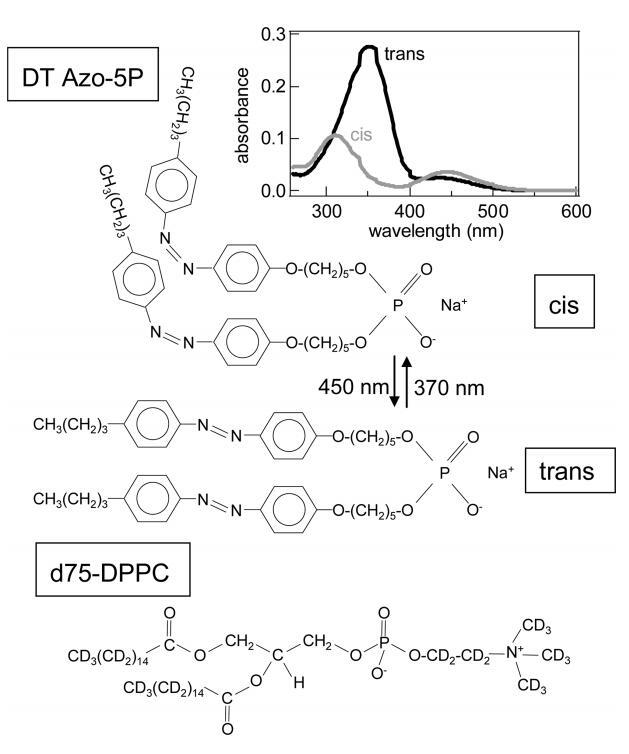圖1。 順式和反式構(gòu)型的光開關(guān)脂質(zhì)DT Azo-5P和d75 DPPC的分子結(jié)構(gòu)。 右上角的插圖顯示了CHCl3中DT Azo-5P的紫外/可見光譜( ~ 在370nm(順式狀態(tài))和450nm(反式狀態(tài))下輻照約10s后,使用7μM,1cm的反應杯。