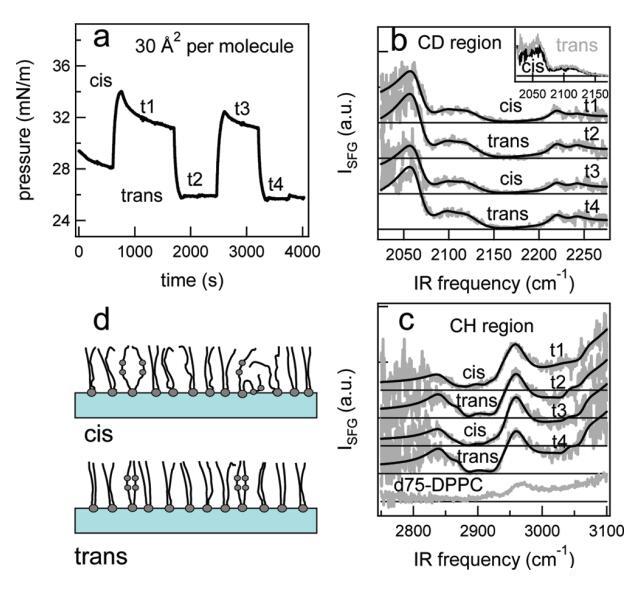 圖7。在脂質(zhì)/H2O界面處,DT Azo-5P/d75 DPPC的1:5混合物的結(jié)果,每個分子的面積為30?2。(a) 表面壓力與時間的關(guān)系。用370和450 nm光照射~100秒分別產(chǎn)生順式(高壓)和反式(低壓)狀態(tài)。壓力的微小劇烈波動是由于樣品高度的變化,以校正水的蒸發(fā)。順式狀態(tài)下表面壓力的降低可能是由于單層的松弛或膠束或囊泡的形成減少了表面脂質(zhì)的數(shù)量。(b) 相應的VSFG光譜(灰色)以及CD區(qū)域的擬合。為了清晰起見,光譜已被抵消。插圖顯示了相互重疊的反式和順式光譜,以強調(diào)差異。(c) VSFG光譜(灰色)以及用于引導眼睛進入CH區(qū)域的擬合。底部曲線顯示了在P時純d75 DPPC的光譜~ 40百萬/米。(d) 脂質(zhì)尾部方向的示意圖。光開關(guān)脂質(zhì)的偶氮苯部分用灰色圓圈表示。