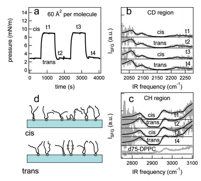 圖6。在脂質(zhì)/H2O界面處,DT Azo-5P/d75 DPPC的1:5混合物的結(jié)果,每個分子的面積為60?2。(a) 表面壓力與時間的關(guān)系。用370和450 nm光照射~100秒分別產(chǎn)生順式(高壓)和反式(低壓)狀態(tài)。壓力的微小劇烈波動是由于樣品高度的變化,以校正水的蒸發(fā)。(b) 相應的VSFG光譜(灰色)以及CD區(qū)域的擬合。為了清晰起見,光譜已被抵消。(c) VSFG光譜(灰色)以及用于引導眼睛進入CH區(qū)域的擬合。底部曲線顯示了在P時純d75 DPPC的光譜~ 40百萬/米。(d) 脂質(zhì)尾部方向的示意圖。光開關(guān)脂質(zhì)的偶氮苯部分用灰色圓圈表示。