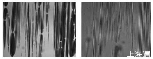 圖5在透射光顯微鏡下,疏水蛋白在40 mN m-1下的壓縮。左側(cè)放大4倍,右側(cè)放大10倍。