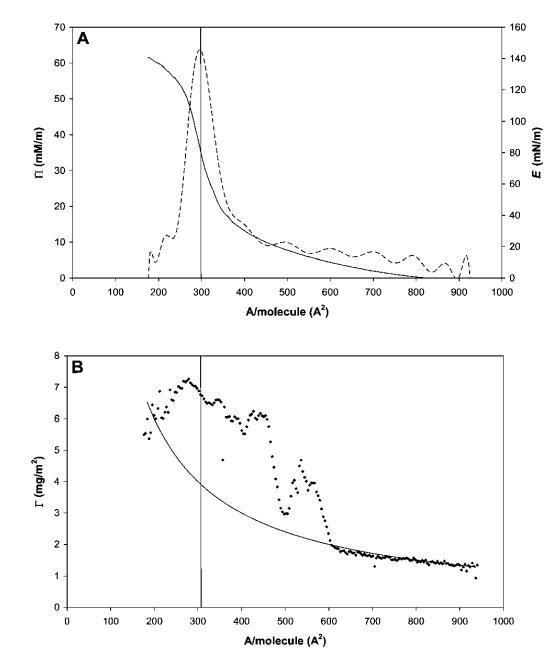圖3 HFBII的代表性壓縮等溫線,壓縮量遠低于每個分子的面積。 (A) P(-)和E(---)與每個分子的面積的關(guān)系。 (B) 攤鋪量和壓縮(Gcomp,-)預期的表面載荷,并通過橢偏儀(Gell,A)測量。