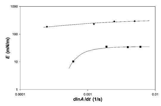 頻率依賴性。 為了評估其中一些系統(tǒng)中粘性損失的重要性,我們對b-lg和HFBII進行了頻率相關(guān)的表面膨脹流變。 對于表面膨脹流變學,我們顯示了在18<P<22 mN m-1之間測量的小變形模量(見圖10)。 注意,變形率d(lna)/dt為0.0012 s 1對應(yīng)于5 mm min 1的勢壘速度,用于大變形實驗。 相比之下,歧化時間約為0.5小時,接近泡沫實驗觀察到的粗化時間。 HFBII的數(shù)據(jù)表明,在所研究的變形速率范圍內(nèi),變形速率對E的影響適中。 對于b-乳球蛋白,頻率的影響更為明顯,因此,在變形速率低于0.001 s 1時,可觀察到E的強烈下降。 這表明b-lg的粘性損失比HFBII更為明顯。 這一比較再次表明,b-lg的外觀更柔軟,壓縮/膨脹時解吸/吸附能力更強。