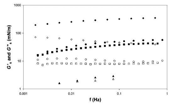 表面剪切流變學。 所有四個系統(tǒng)的表面剪切流變測量如圖11所示。 我們觀察到HFBII具有模量,比b-乳球蛋白和皂甙高一個數(shù)量級,這與早期結(jié)果一致。25值得一提的是,對于像奎拉葉皂甙這樣的表面活性劑,測得的表面剪切彈性非常高。 b-酪蛋白的表面剪切模量要低一個數(shù)量級。 關(guān)于頻率,我們發(fā)現(xiàn)與HFBII相比,皂甙和b-乳球蛋白對頻率的依賴性更強,尤其是在低頻率下。 此外,對于HFBII而言,Gs 00/Gs0的比率是最低的,即表面彈性對模量的貢獻比表面粘度大得多。 當我們向交叉點外推時,我們預計HFBII和b-乳球蛋白或皂甙之間的弛豫時間會有一個數(shù)量級的差異。 對于b-酪蛋白,從0.01 Hz左右的數(shù)據(jù)可以很容易地觀察到交叉點。