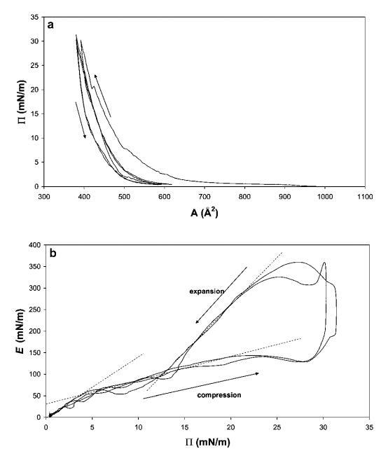 藜蘆皂甙??~皂苷的壓縮曲線如圖6所示。該皂甙在拐點處顯示出非常高的表面壓力,最大表面壓力為45 mN m-1。此外,皂甙表現(xiàn)出很寬的遲滯回線。從E–P曲線推斷出斜率為4.3,觀察到E中出現(xiàn)2個平滑的峰,這可能表明界面中存在相變,從皂甙的相對拉長的疏水區(qū)域判斷。27當屏障方向逆轉(zhuǎn)時,觀察到E中存在較大的超調(diào),表明膜破裂,類似于HFBII。