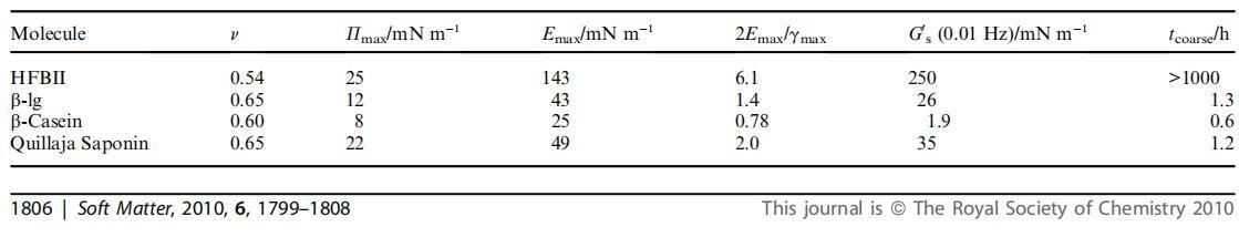 當我們現(xiàn)在再次考慮表1中的2Emax/gmax比率時,很明顯HFBII超過了5的值,這表明這將穩(wěn)定泡沫,防止收縮。 根據(jù)Kloek等人的說法,對于b-乳球蛋白和皂甙,我們報告的值介于1和2之間,表明氣泡收縮延遲,但沒有完全停止。2食品蛋白質(zhì)通常屬于這種狀態(tài),對歧化過程的抵抗力相對較小。10最后, 根據(jù)這個比率,b-酪蛋白根本無法抵消氣泡收縮,因為2Emax/gmax<1,這是主要的吉布斯標準。