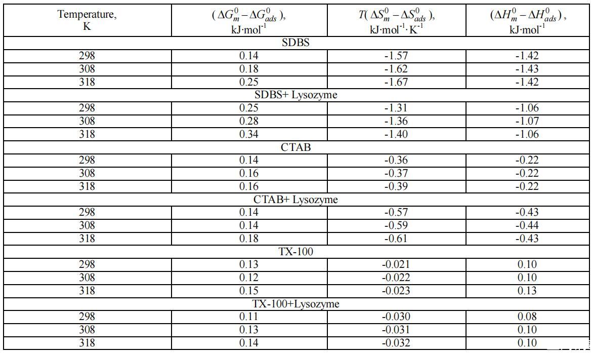 在溶菌酶存在和不存在的情況下,不同種類表面活性劑的物理化學(xué)和熱力學(xué)性質(zhì)如下所述: