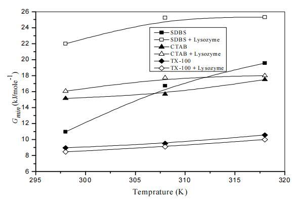 圖1。不同表面活性劑在溶菌酶存在和不存在時(shí)Gmin隨溫度的變化