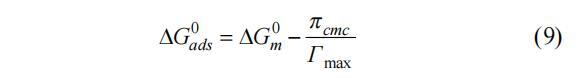 使用公式(8)[32]計(jì)算在cmc下獲得的最大吸附摩爾自由能Gmin: