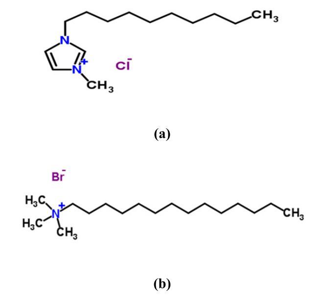因此,牢記混合表面活性劑的上述優(yōu)點(diǎn),已嘗試研究陽(yáng)離子表面活性劑與表面活性離子液體在純水中以及在二甘醇(DEG)-水二元混合物存在下的混合膠束化,為了進(jìn)一步了解二甘醇對(duì)這些混合體系的影響。所使用的離子液體為1-癸基-3-甲基咪唑氯化物[C10min][Cl],陽(yáng)離子表面活性劑為十六烷基三胺(CET),陰離子染料為甲酚紅(CR)(方案1)。ILs在兩相均相催化過(guò)程中也有廣泛的應(yīng)用,在這些催化過(guò)程中,含有催化劑的一相與含有反應(yīng)物和產(chǎn)物的第二相完全不混溶。正如我們所知,二甘醇是一種有機(jī)溶劑,因此大多數(shù)催化反應(yīng)被認(rèn)為發(fā)生在離子液體和有機(jī)溶劑的界面[26]。