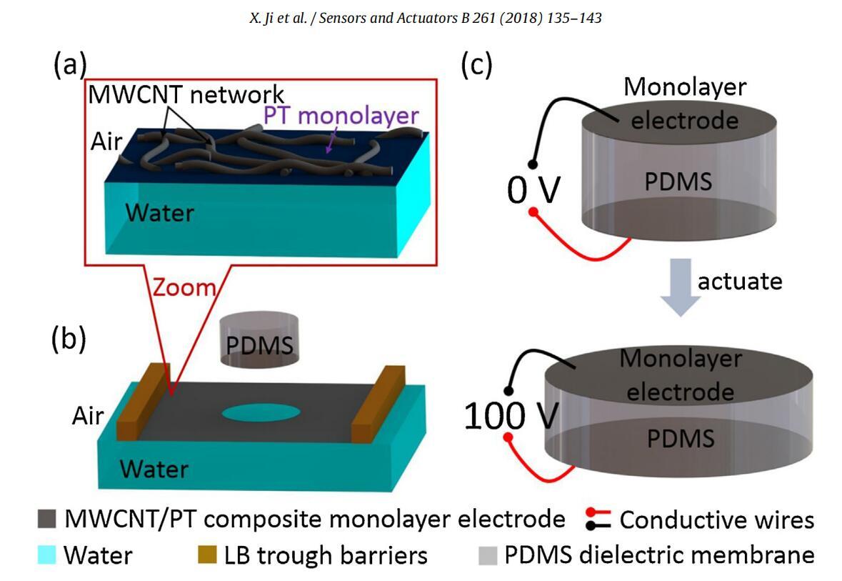 圖1。使用Langmuir-Schaefer轉(zhuǎn)移單層電極制作低壓DEA(a)在空氣-水界面形成的單層復(fù)合電極:嵌入聚(烷基噻吩)(PT)單層內(nèi)的互連MWCNT網(wǎng)絡(luò)。(b)Langmuir-Schaefer(LS)將復(fù)合單分子膜從空氣-水界面轉(zhuǎn)移到PDMS介電膜上,制成DEA的一個電極。(c)DEA由一層1.4μm厚的硅酮膜組成,硅酮膜夾在兩個亞100 nm厚的復(fù)合單層電極之間。