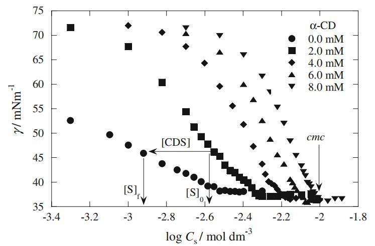 圖1顯示了2 mM Mega-10和DPS溶液的界面張力(γ)隨不同α-CD濃度的變化。兩種表面活性劑溶液的界面張力值均隨α-CD濃度的增加而增加。這種行為表明α-CD與Mega-10和DPS形成包合物,這些包合物沒有任何表面活性。在沒有α-CD的情況下,不同濃度的α-CD的界面張力對應(yīng)于γ值,這證實(shí)了CD本身不具有表面活性(數(shù)據(jù)未顯示)。圖2顯示了Mega-10和DPS(αDPS=0.8)混合體系在不同α-CD濃度下的總表面活性劑濃度的γvs.log曲線。每條曲線顯示與cmc對應(yīng)的斷點(diǎn)。在圖2中,由于α-CD中加入了表面活性劑單體,通過降低本體中的游離表面活性劑單體濃度延遲了膠束形成過程,因此每條曲線也移向更高的表面活性劑濃度。此外,cmc以上表面活性劑的γ值與α-CD濃度無關(guān)(圖2)。這表明表面活性劑與α-CD形成的包合物不參與界面吸附。在α-DPS=0.0、0.2、0.4、0.6和1.0時(shí),在不存在和存在2-8mmα-CD濃度的情況下,獲得了類似的曲線圖(數(shù)據(jù)未顯示)。Mega-10和DPS的α-CD濃度依賴性cmc值如圖3所示。圖3清楚地顯示了cmc和α-CD濃度之間的線性關(guān)系。這一行為是表面活性劑和α-CDs之間形成包合物的另一個(gè)跡象,導(dǎo)致表觀cmc值增加。純Mega-10(5.75 mM)和DPS(2.57 mM)測定的cmc值與報(bào)告的文獻(xiàn)值一致[24–26]。