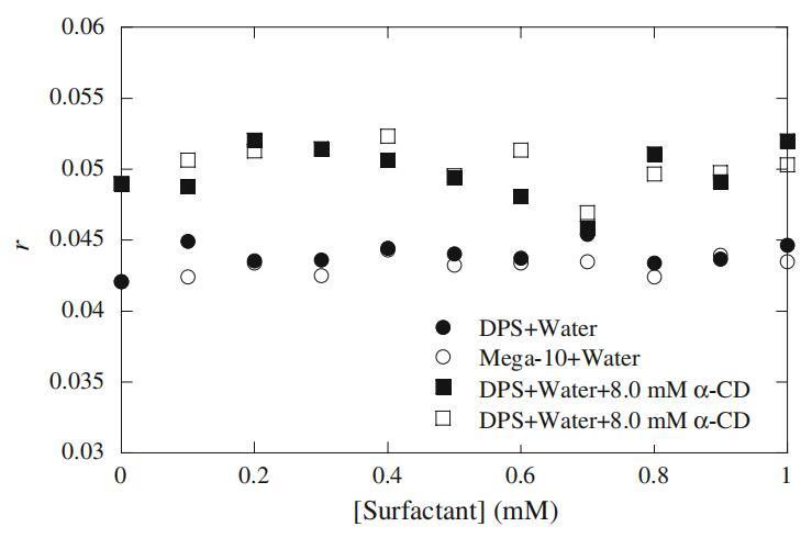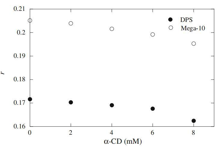 在這項(xiàng)工作中,我們研究了RB與表面活性劑-α-CD-水三元體系的詳細(xì)相互作用,以便系統(tǒng)地研究RB的極化行為。在進(jìn)入膠束介質(zhì)之前,我們排除了RB與水溶液和水溶液α-CD介質(zhì)中前冰層表面活性劑濃度(1 mM)的結(jié)合行為。圖10顯示了在冰層前表面活性劑濃度下,Mega-10和DPS的RB各向異性行為。在水中和存在α-CD(8mm)的情況下,我們未觀察到表面活性劑RB的右旋值有任何顯著變化。從圖10獲得的結(jié)果意味著探針RB不與表面活性劑單體、環(huán)糊精和α-CD表面活性劑包合物結(jié)合。在這些初始測量之后,我們將我們的實(shí)驗(yàn)方法擴(kuò)展到膠束介質(zhì),以觀察RB的各向異性行為。圖11顯示了純表面活性劑以及Mega-10和DPS二元混合物(15mm)的α-CD(2-8mm)依賴性各向異性行為。從圖11可以得出一些有趣的結(jié)論。首先,圖11清楚地表明,在水介質(zhì)中,純Mega-10的膠束比DPS的膠束具有更高的微粘度。這種行為可以用表面活性劑分子在膠束中的堆積排列來解釋,表明Mega-10膠束中的堆積比DPS膠束中的更緊密。對于二元混合物,r值隨著DPS(αDPS)摩爾分?jǐn)?shù)的增加而減小,這表明DPS被誘導(dǎo)到混合膠束中產(chǎn)生的剛性結(jié)構(gòu)較低(參見圖11中最左邊的圖例)。其次,在DPS的每摩爾分?jǐn)?shù)下,r值隨α-CD濃度的增加而線性減小。盡管隨著α-CD濃度的增加,在αDPS=0.0時(shí),r值的下降更為瞬時(shí)。我們注意到,r值的瞬時(shí)降低是由于膠束濃度的降低。為了證實(shí)這一結(jié)果,我們在20 mM濃度下對αDPS=0.0(即Mega-10)進(jìn)行了各向異性測量,圖12中繪制了Mega-10的觀測r值,并與15 mM濃度下的αDPS=1.0(即DPS)進(jìn)行了比較。正如我們所見,隨著α-CD濃度的增加,Mega-10(20 mM)的r值沒有瞬時(shí)下降,這表明圖11中r值的急劇下降是由于膠束濃度的降低。DelaCruz等人研究了RB衍生物與陰離子、陽離子和非離子表面活性劑的相互作用,并得出結(jié)論,RB衍生物的酯鏈的電荷和長度控制著與不同膠束系統(tǒng)的相互作用[35]。